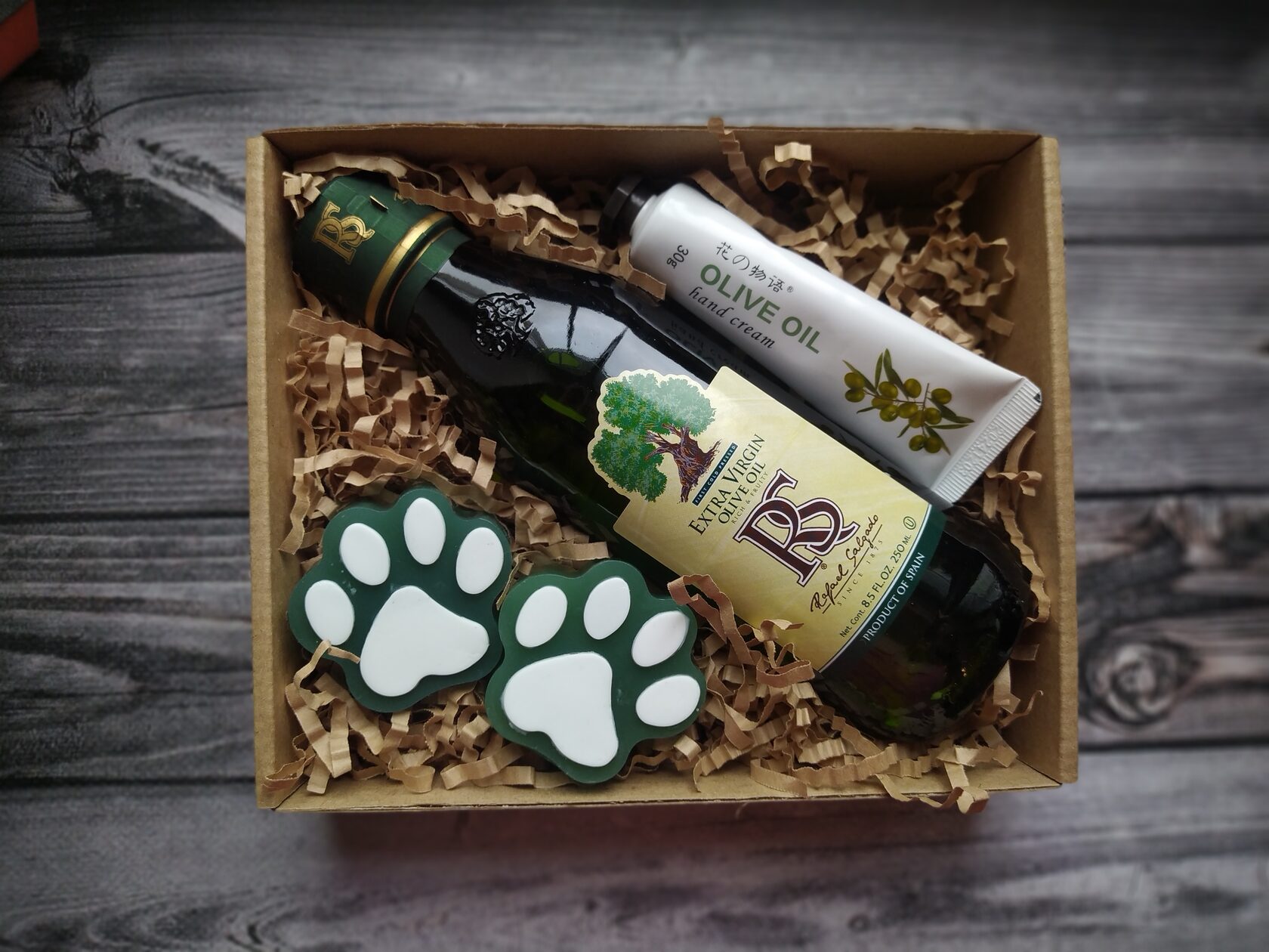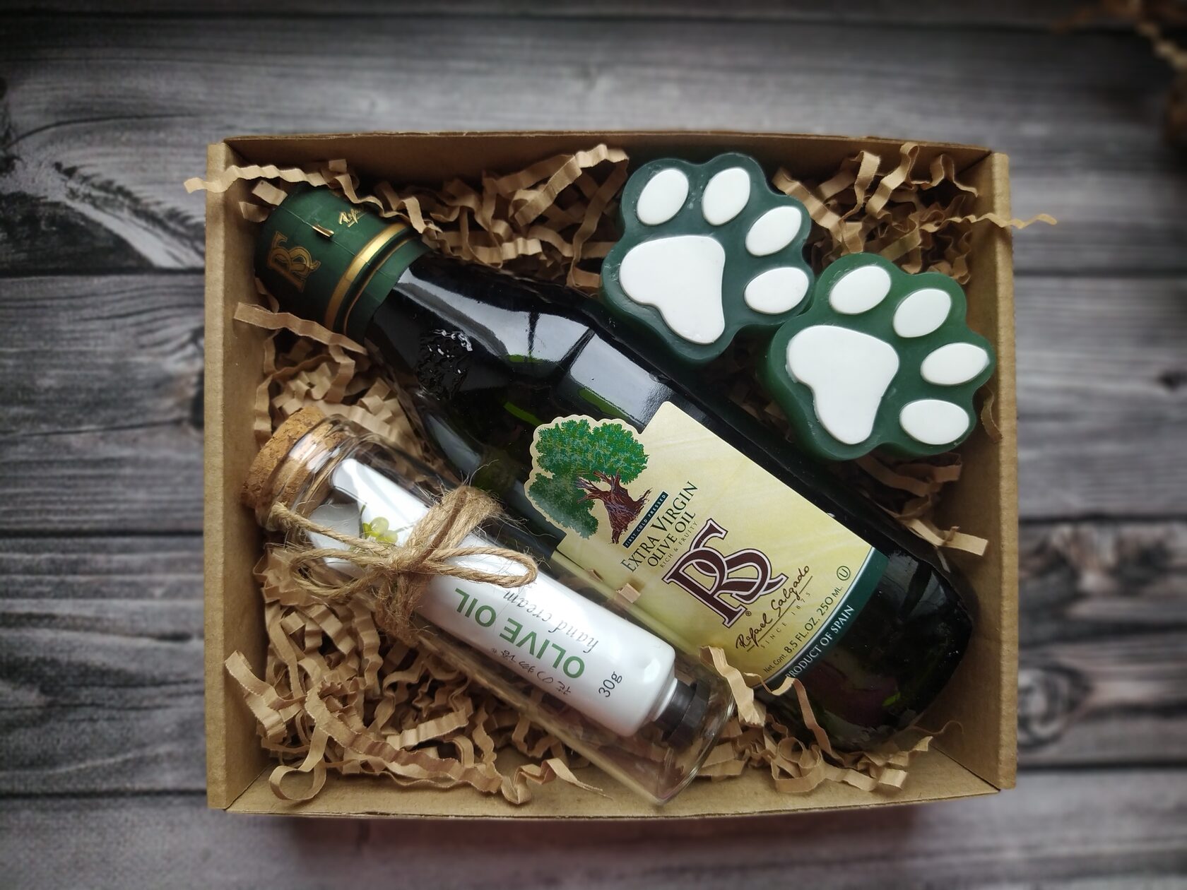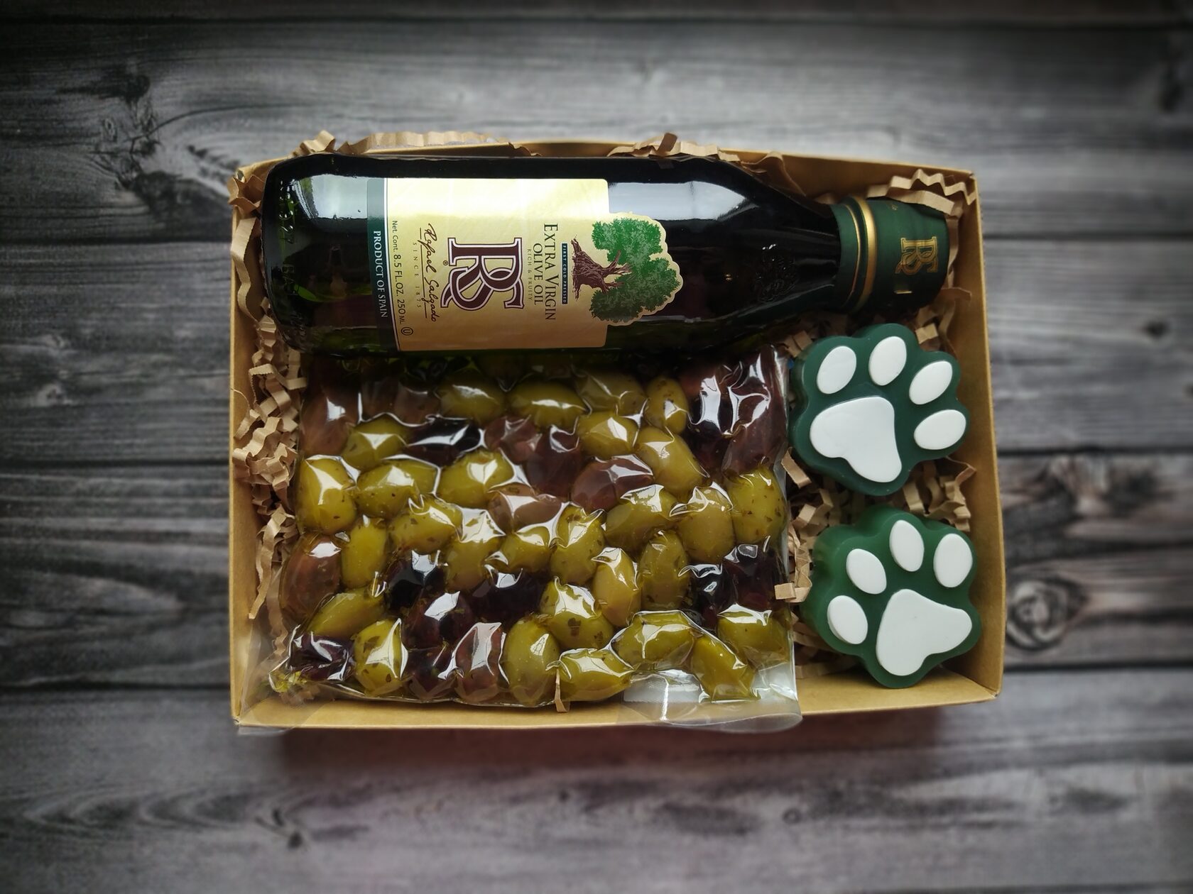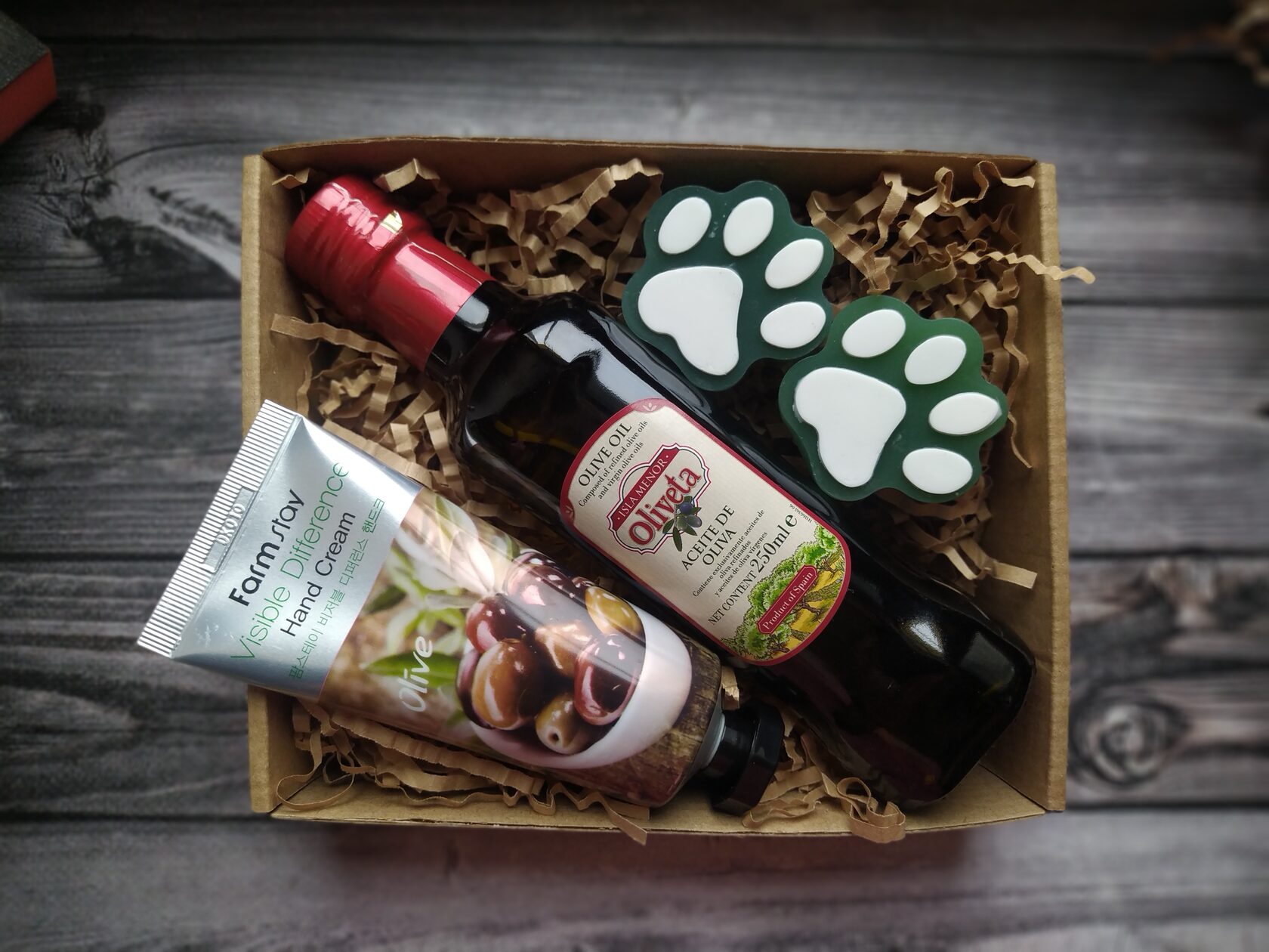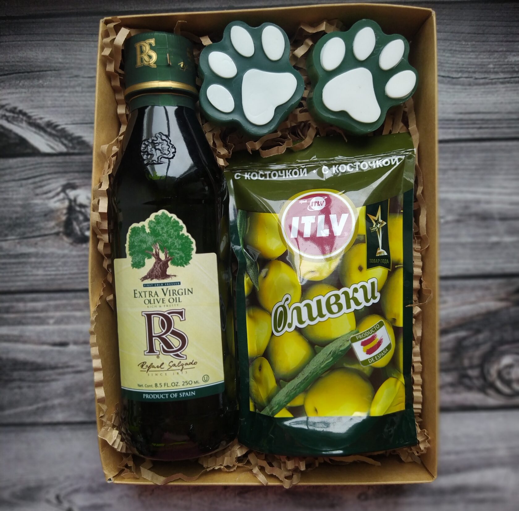 В состав набора входит: - Оливковое масло extra virgun в стекле (250 ml) - Оливки маринованные в вакууме - Мыло ручной работы (Лапки) с оливковым маслом 2 шт