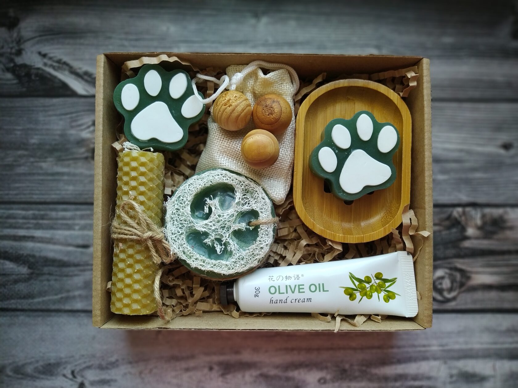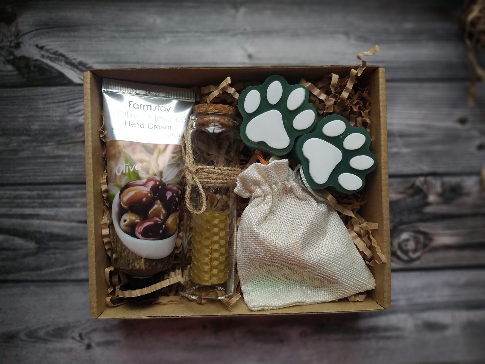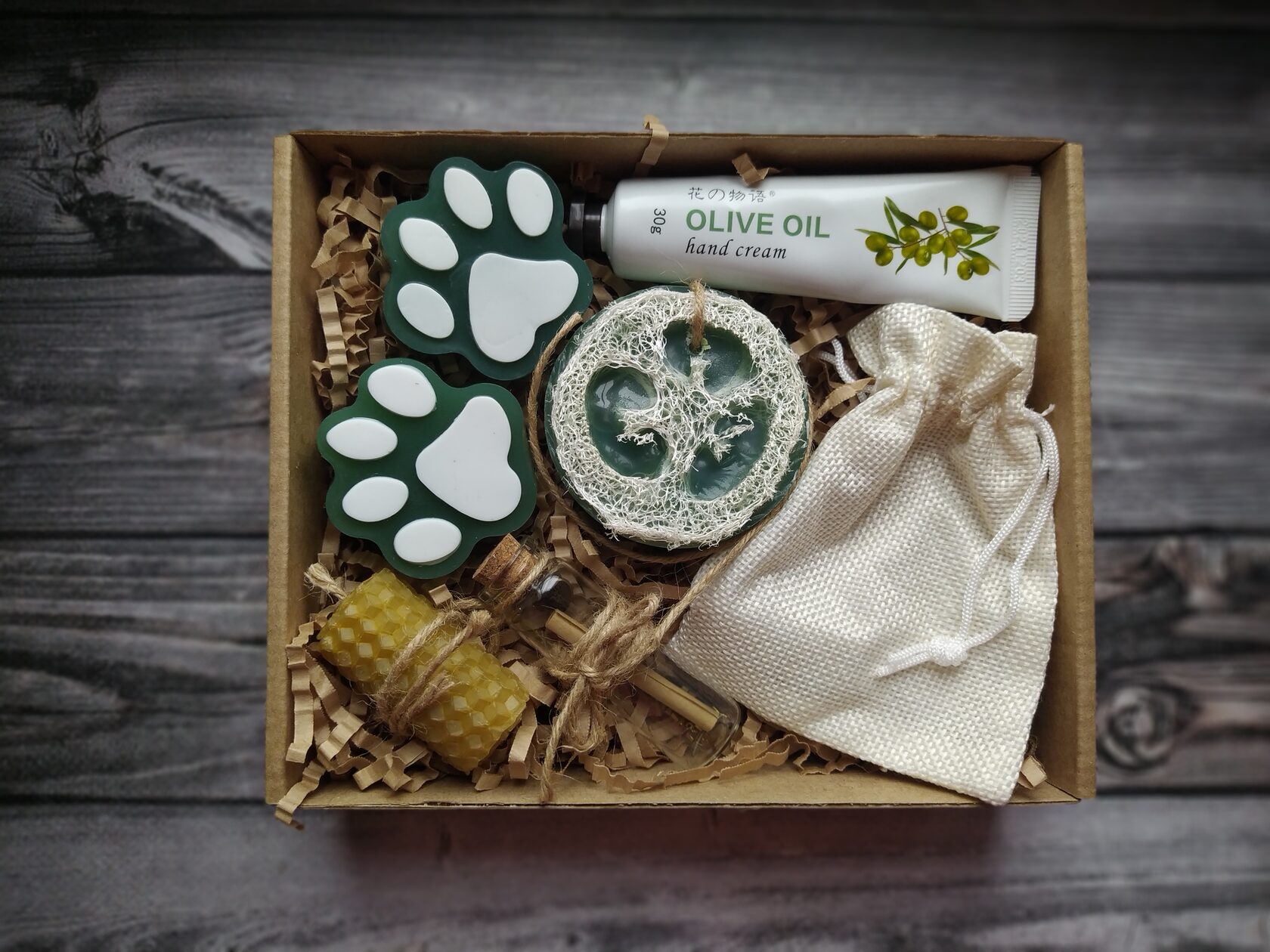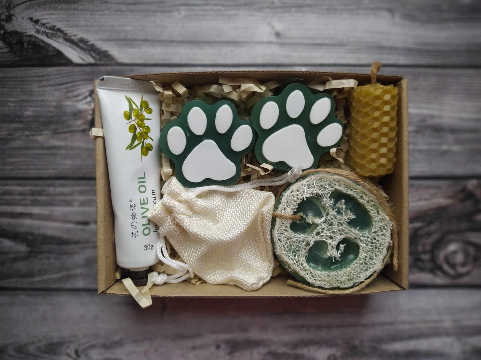В состав набора входит: - Крем для рук с экстрактом оливки (30 мл) - Мыло ручной работы (Лапки) с оливковым маслом 2 шт - Свеча из натуральной медовой вощины - Мыло ручной работы с натуральной мочалкой-люфой - Натуральный древесный ароматизатор в холщовом мешочке - Натуральная бамбуковая мыльница