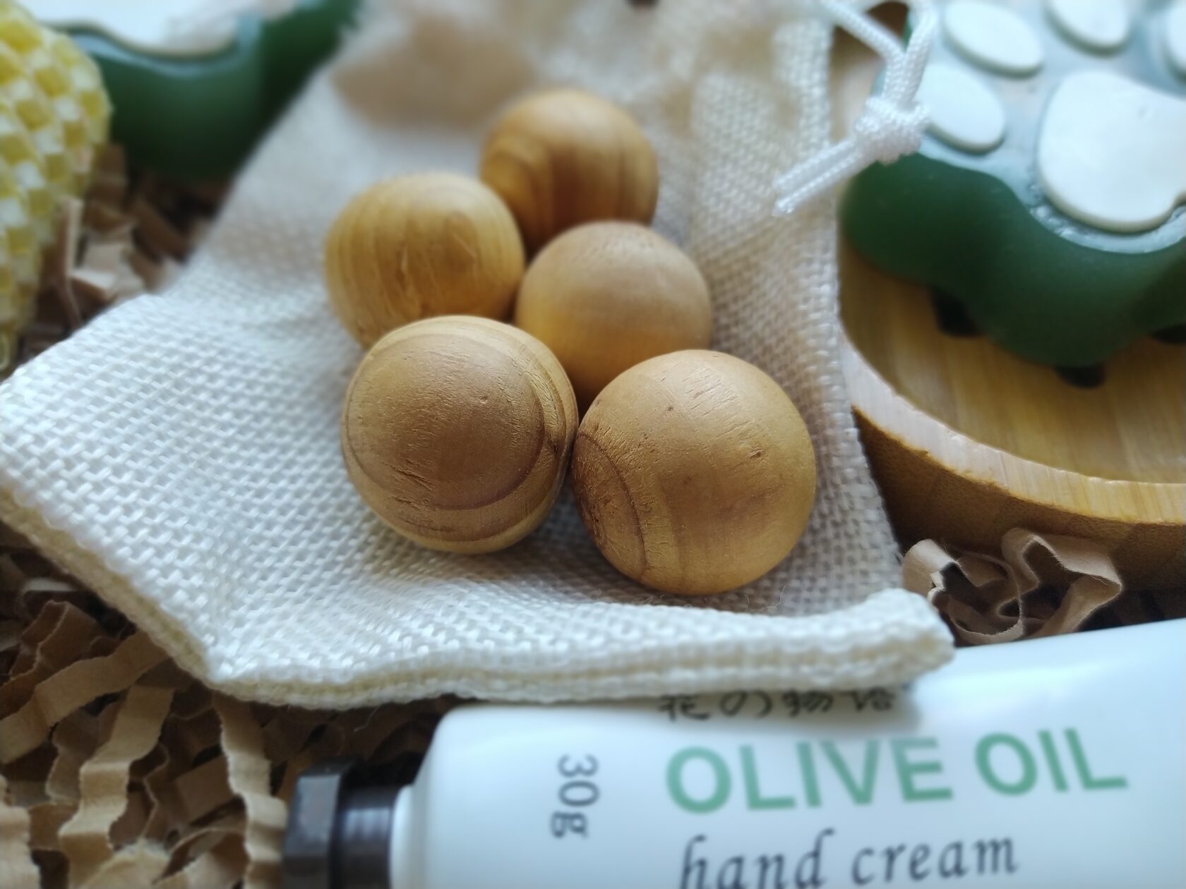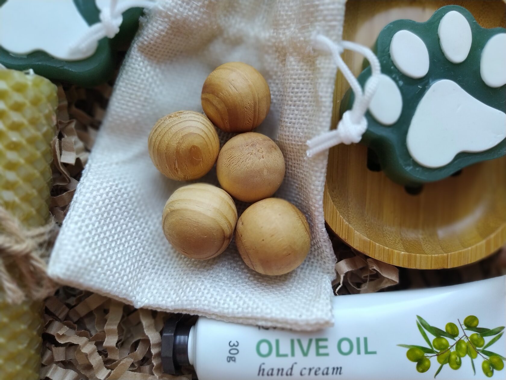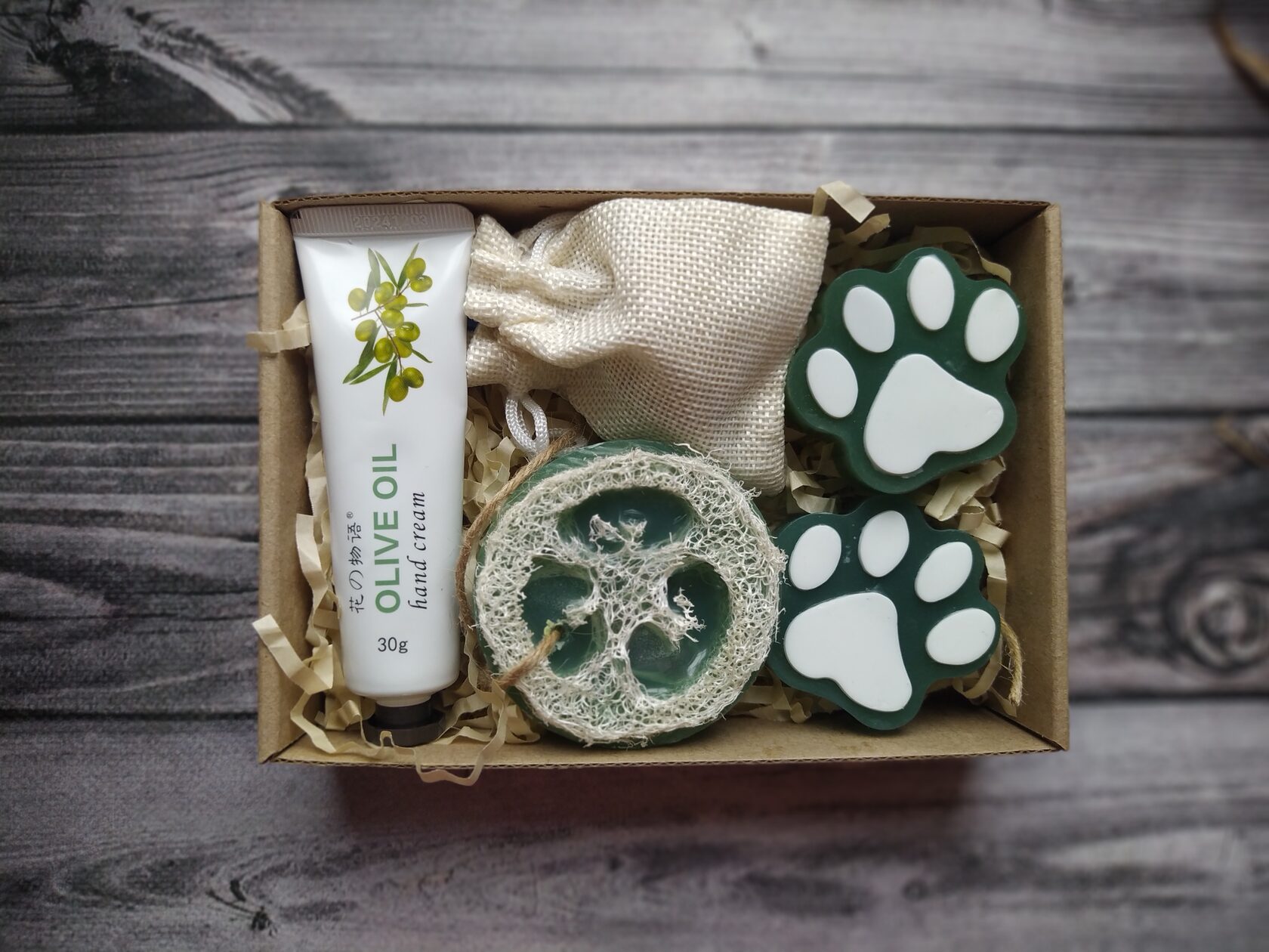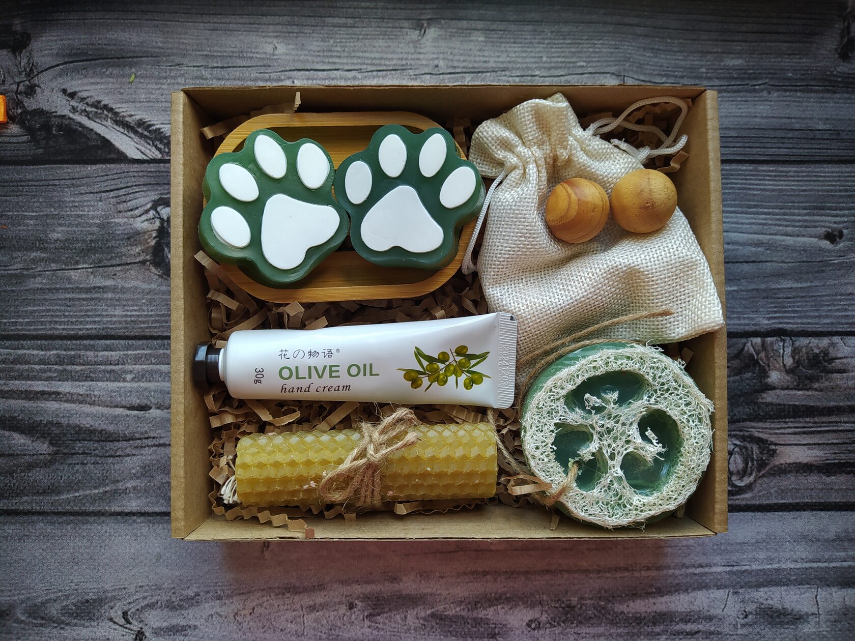 В состав набора входит: - Крем для рук с экстрактом оливки (30 мл) - Мыло ручной работы (Лапки) с оливковым маслом 2 шт - Свеча из натуральной медовой вощины - Мыло ручной работы с натуральной мочалкой-люфой - Натуральный древесный ароматизатор в холщовом мешочке - Натуральная бамбуковая мыльница