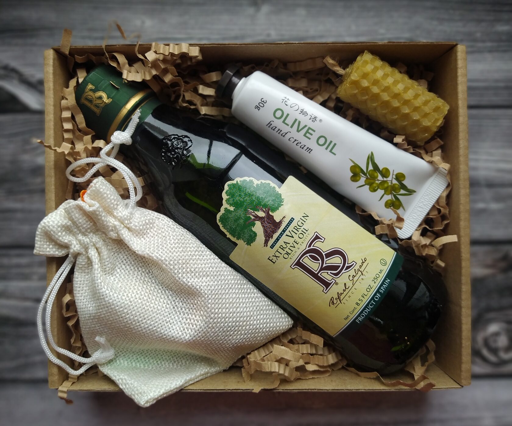 В состав набора входит: - Оливковое масло extra virgun в стекле (250 ml) - Крем для рук с экстрактом оливки (30 мл) - Свечка mini натуральная из вощины - Натуральный древесный ароматизатор в виде шариков в холщовом мешочке