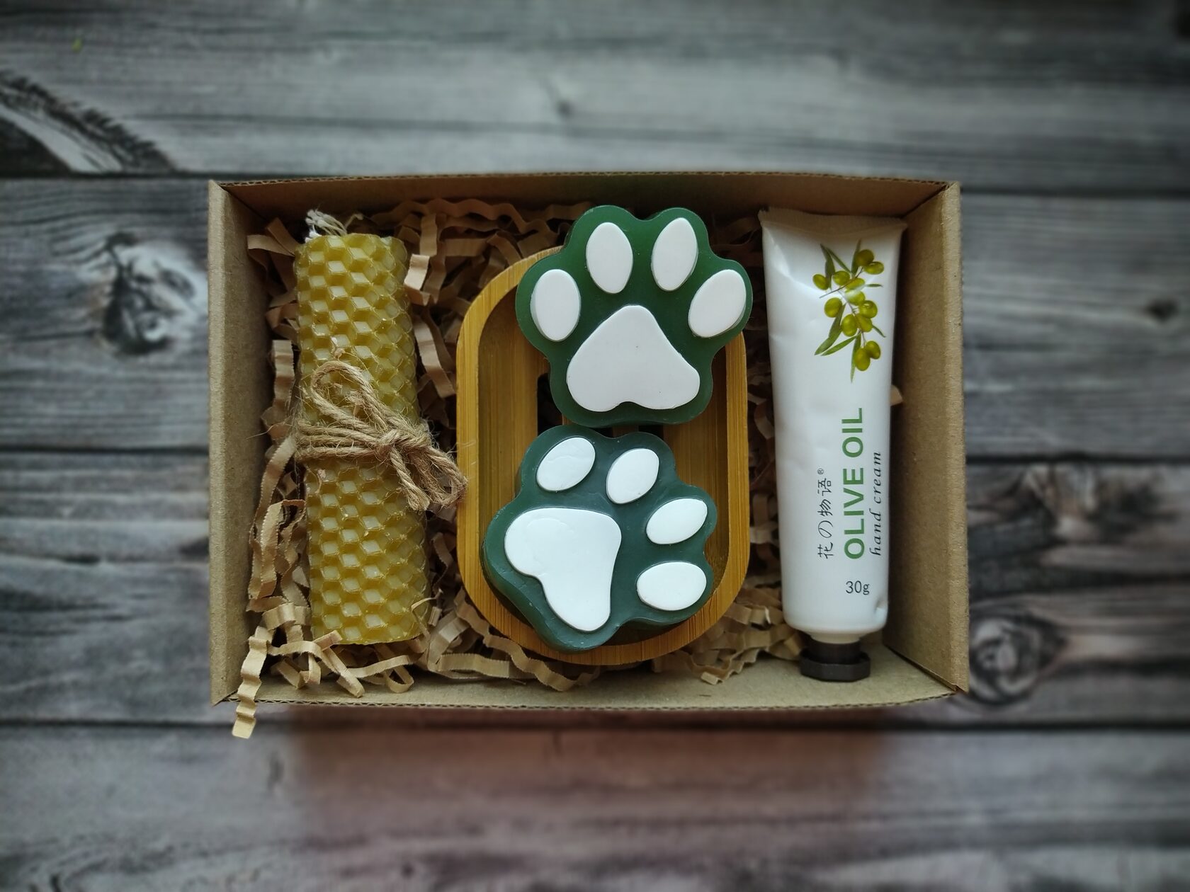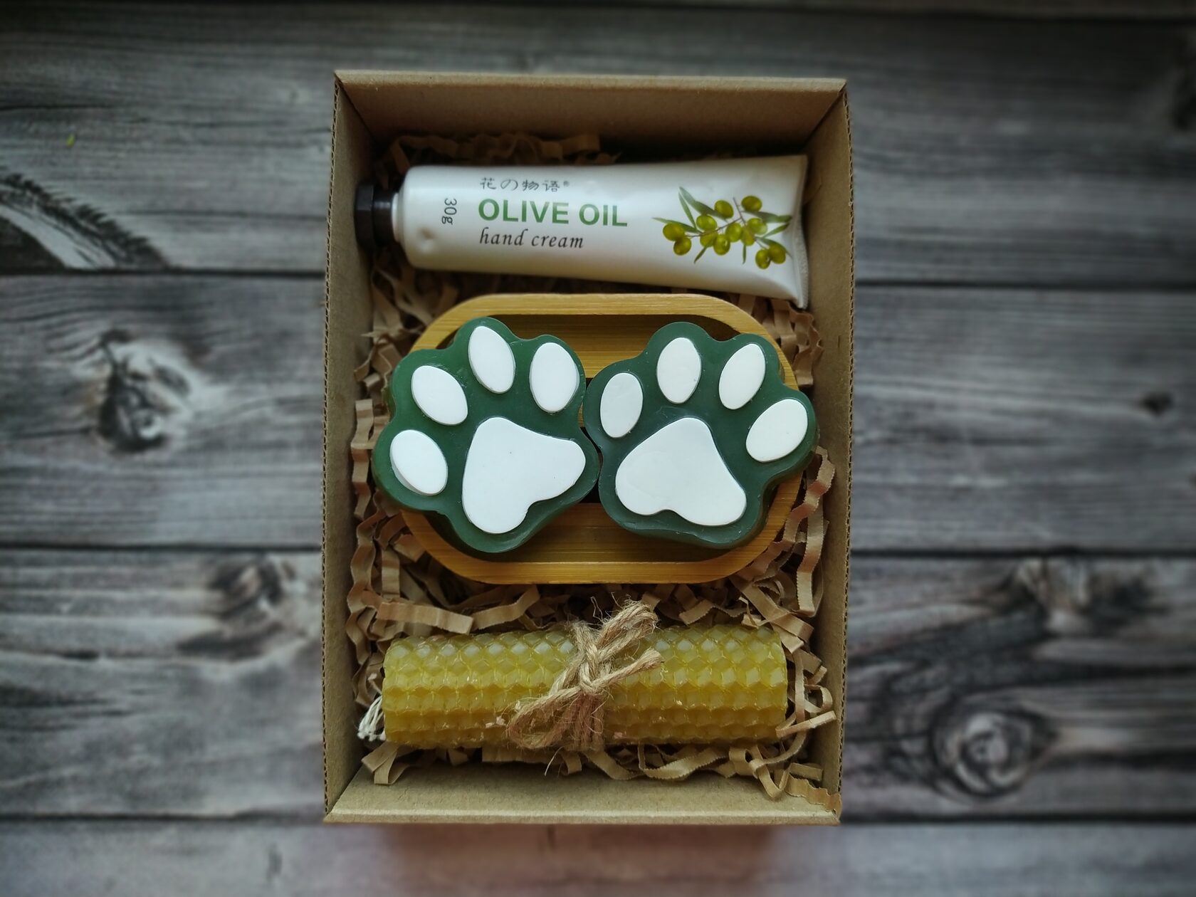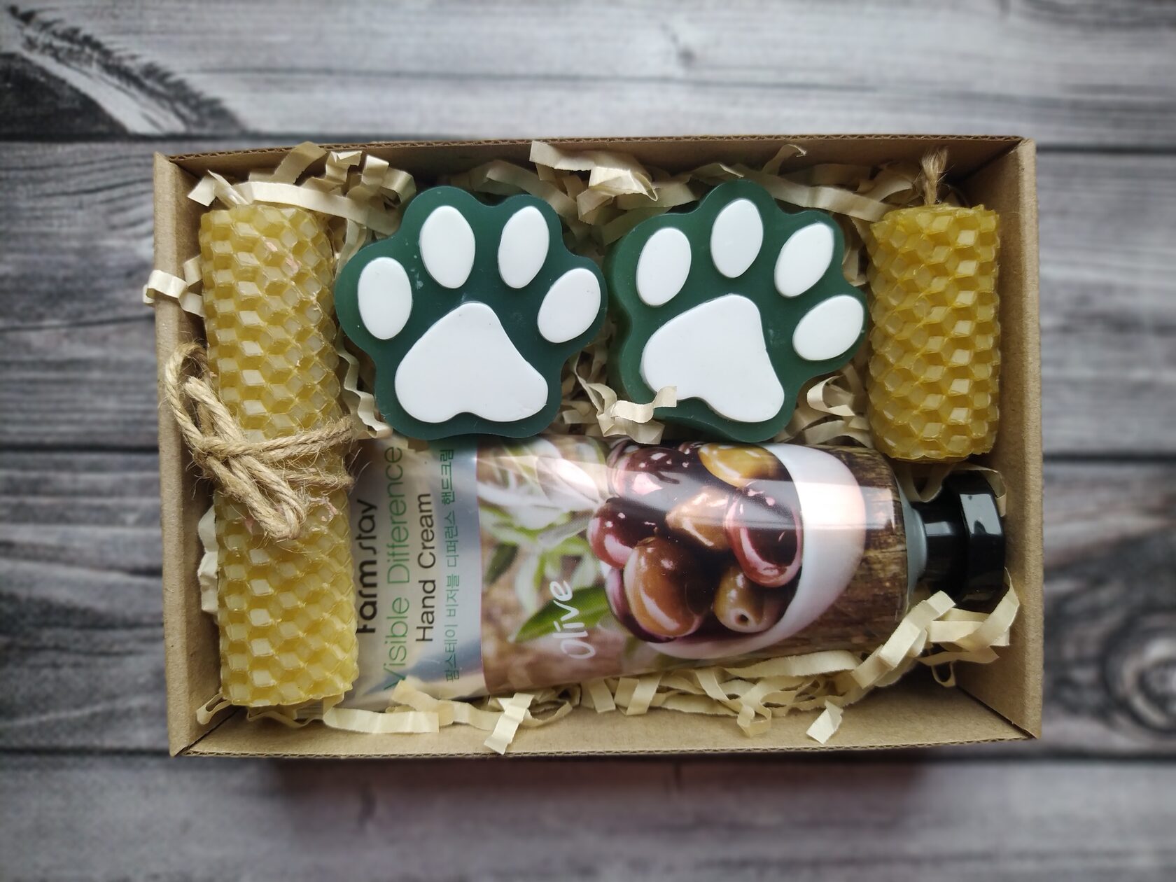 В состав набора входит: - Крем для рук с экстрактом оливки в тубе (100 мл) - Мыло ручной работы (Лапки) с оливковым маслом 2 шт - Мини свечка из медовой вощины - Большая свечка из медовой вощины