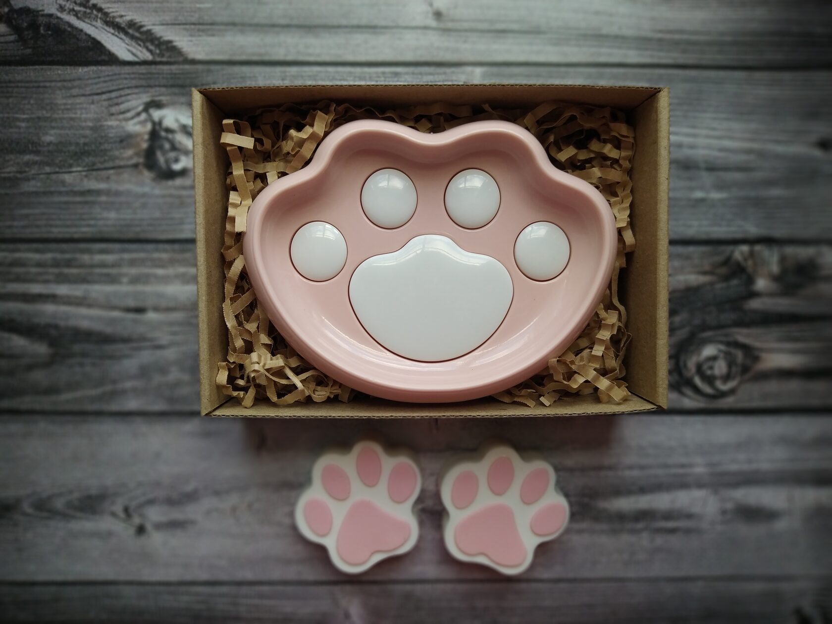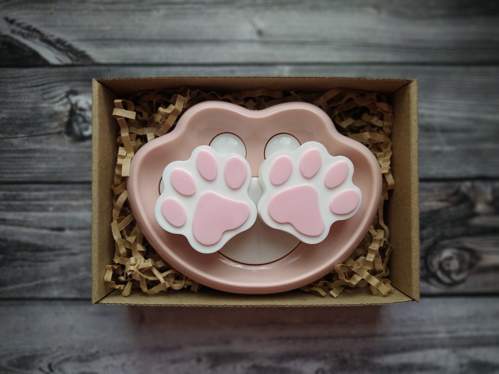 В состав набора входит: - Мыло ручной работы (Лапки) 2 шт - Пластиковая мыльница со съемным верхом в форме кошачьей лапки.