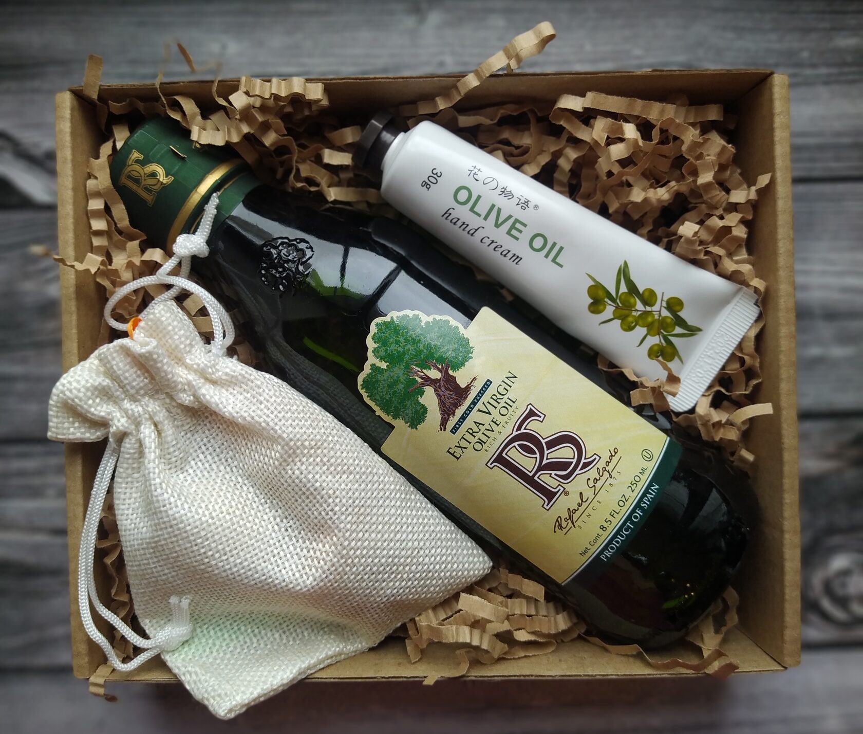 В состав набора входит: - Оливковое масло extra virgun в стекле (250 ml) - Крем для рук с экстрактом оливки (30 мл) - Натуральный древесный ароматизатор в виде шариков в холщовом мешочке (см.доп.фото)